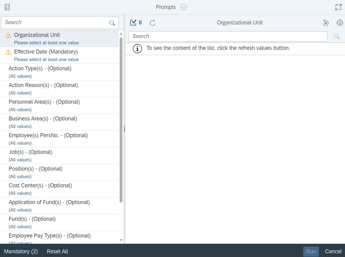 This report is generated after selecting values for the mandatory prompts. All mandatory prompts must have values selected before the Run Icon can be used to generate the report. Mandatory prompts can be identified as mandatory by the exclamation mark inside of the yellow-orange triangle, the square with the checkmark, or the display of (Mandatory). Detailed instructions for interaction with each prompt can be found on the Web Intelligence Prompt List on the OSC website.