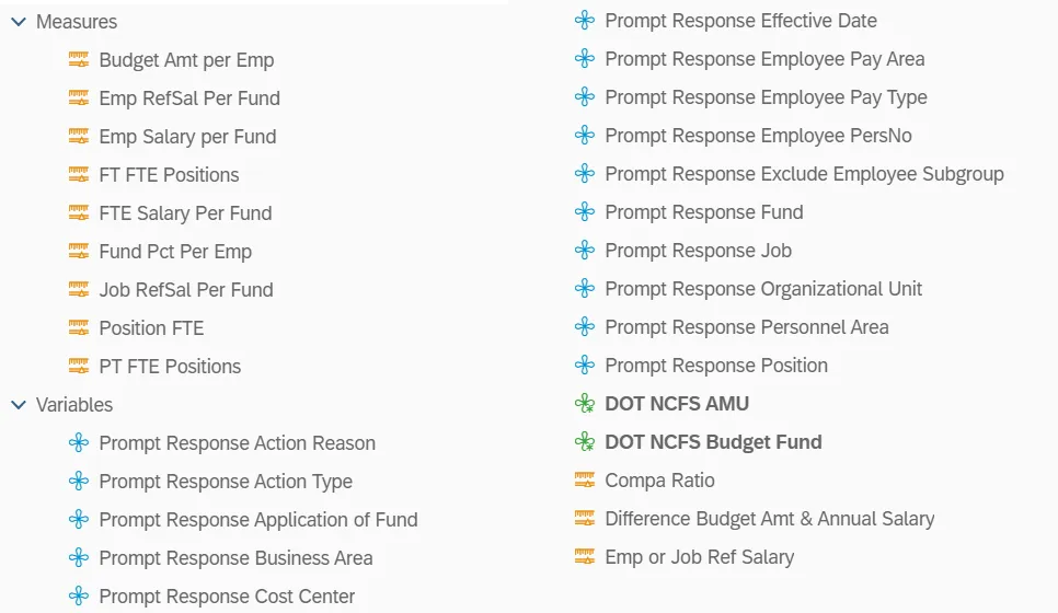 - NCDOT (NC02) specific fields DOT NCFS AMU and DOT NCFS Budget Fund are listed as BOBJ Variables in this report and are derived from NCDOT cost centers and Person Responsible (Addl Center Ref) values from SAP HR Payroll ERP system.