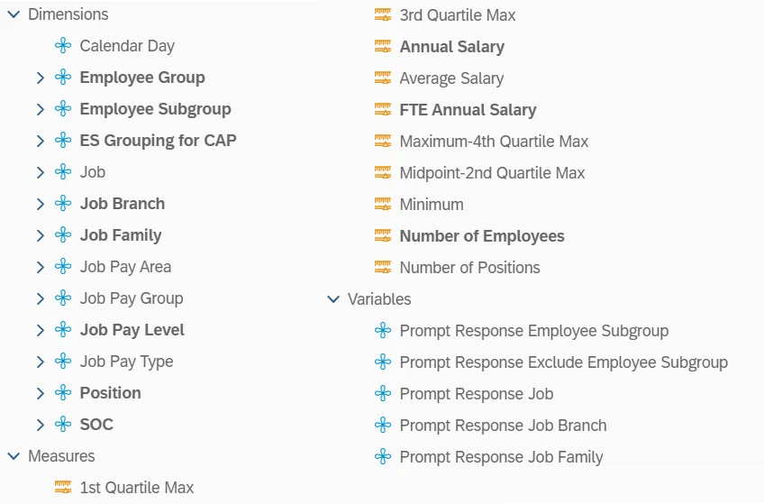 - The 1st Quartile Max on the report is populated from the salary table’s Pay Level 01 Maximum Salary (63,947).
