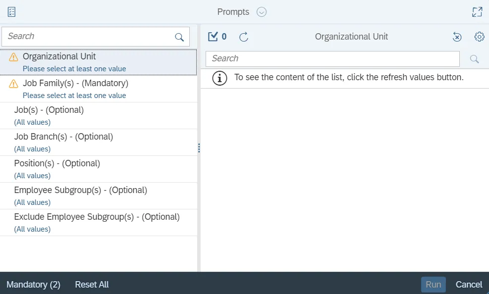 This report is generated after selecting values for the mandatory prompts. All mandatory prompts must have values selected before the Run Icon can be used to generate the report. Mandatory prompts can be identified as mandatory by the exclamation mark inside of the yellow-orange triangle, the square with the checkmark, or the display of (Mandatory). Detailed instructions for interaction with each prompt can be found on the Web Intelligence Prompt List on the OSC website.