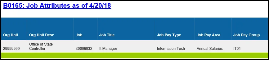 - The report can be used to compare the job classifications statewide to job classifications within a specific agency. In order to compare, the “B0165-1 Job Attributes without Org Unit” report would also need to be generated for the same job classification(s) to obtain statewide information. The results from these two reports would then need to be evaluated manually.