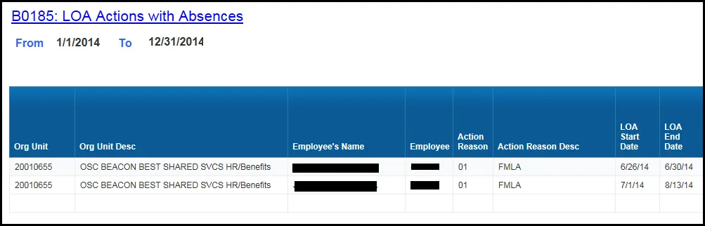 The report is generated with a list of Leave of Absence (LOA) Actions for each employee who was on LOA during the time frame selected. Below is a sample of the report: