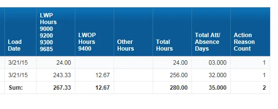- Leave with Pay (LWP) hours: Time entered using the Attendance/Absence (A/A) type