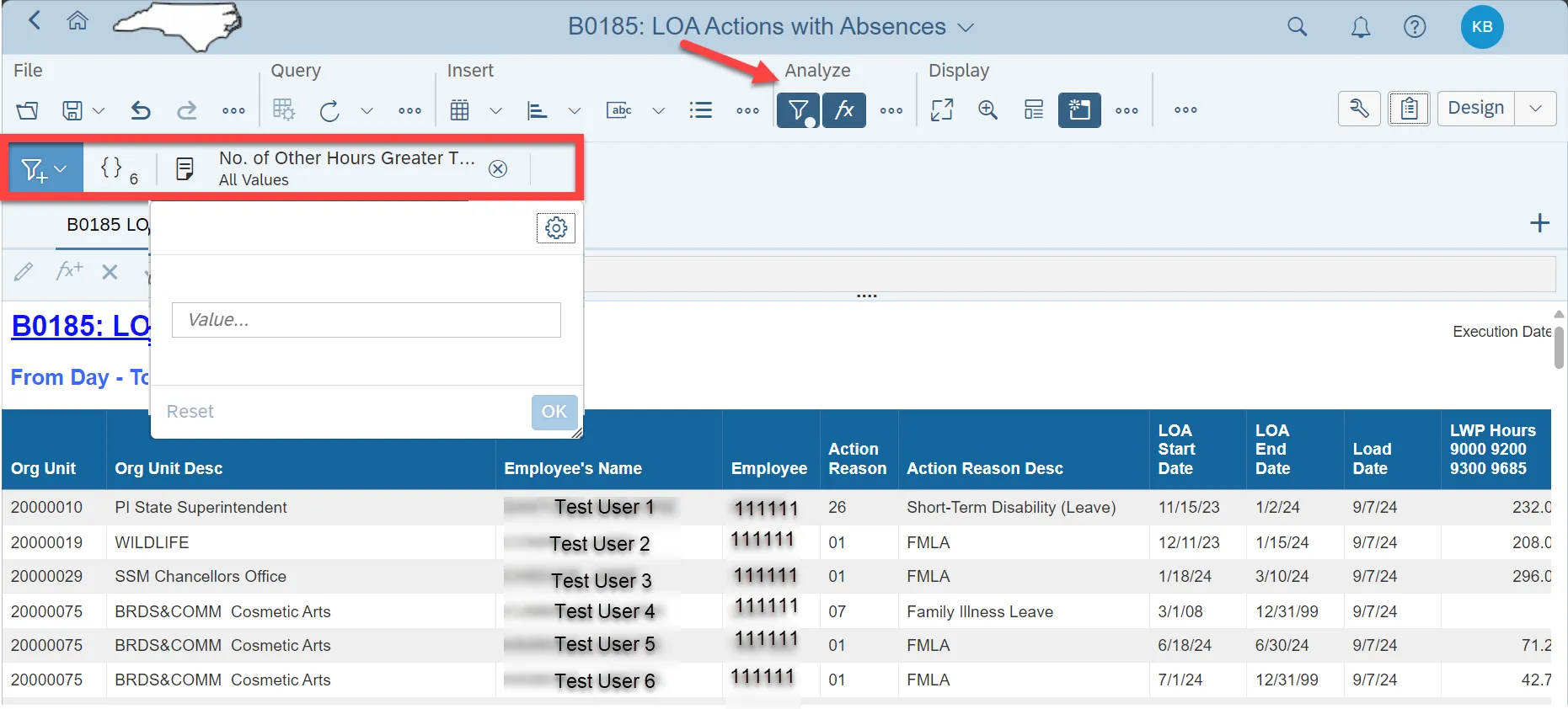 - To reverse the condition set, click reset in the Input Control and press OK. The ‘No.of Other Hours Greater Than’ field in Input Controls should be blank.