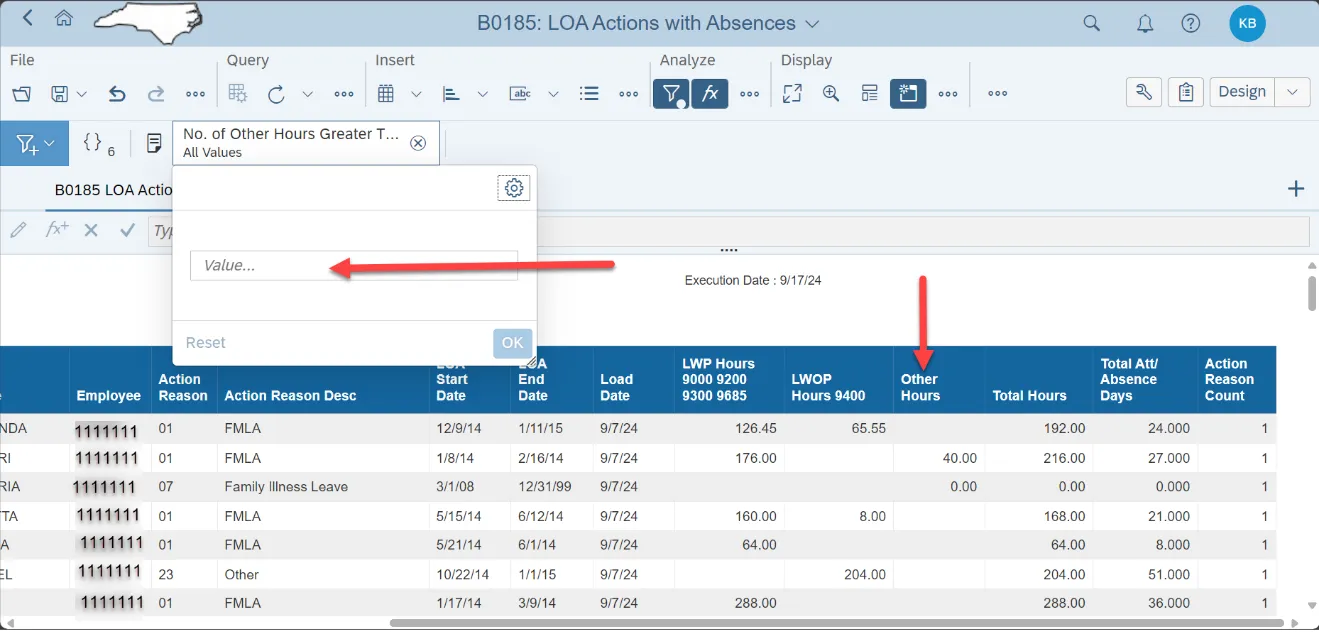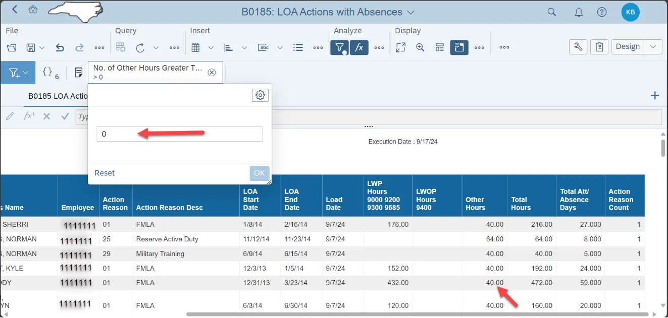 - This input control feature can be used to reduce the number of records in the report to only those where the employee has entered time other than leave during their LOA event. Time entered other than leave during the LOA event is generally incorrect and will cause errors during the time evaluation processing. If the condition is set to a zero in the ‘No.of Other Hours Greater Than:’ field, this will result in the records being filtered for any entries greater than zero in the ‘Other Hours’ column.