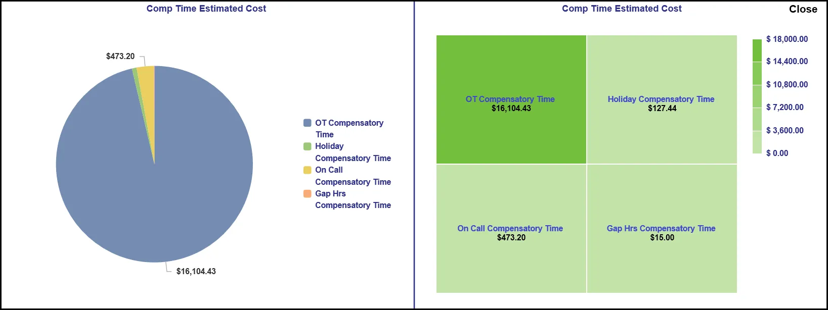 - Detailed view icon on ‘Comp Time Hours’ chart will display a full screen view of a pie chart and a Heat Map showing Comp Time Estimated Cost by Quota Types.