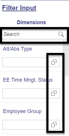 - Note: To exclude Temp Employees, Filter Input panel filters on Employee Group dimension values ‘O’ and ‘X’ can be used, and filter on Employee Subgroup dimension to exclude specific employee subgroups.