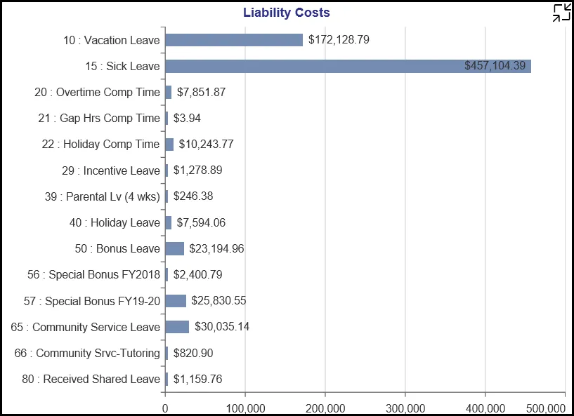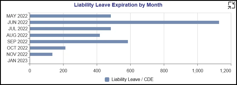 - Liability tab is a combination of the leave hours taken and estimated cost for the month from Time eval. The Liability Leave Expiration by Month tile provides the number of hours of Adverse Weather and CDE Care Leave outstanding and the potential hours to expire by month.