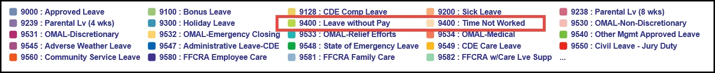 - Att/Abs Type key value ‘9400’ has text description ‘9400: Leave without Pay’ for Regular FT and PT employees and key value ‘A0009400’ has text description ‘9400: Time Not Worked’ for Temporary employees in ERP HR Payroll System. This may appear in ‘Absenteeism by Calendar Month’ full screen detail view chart with ‘9400’ text description if there are Absence hours entered for both types of employees: Regular and Temporary employees.