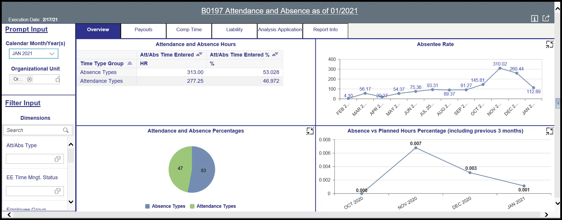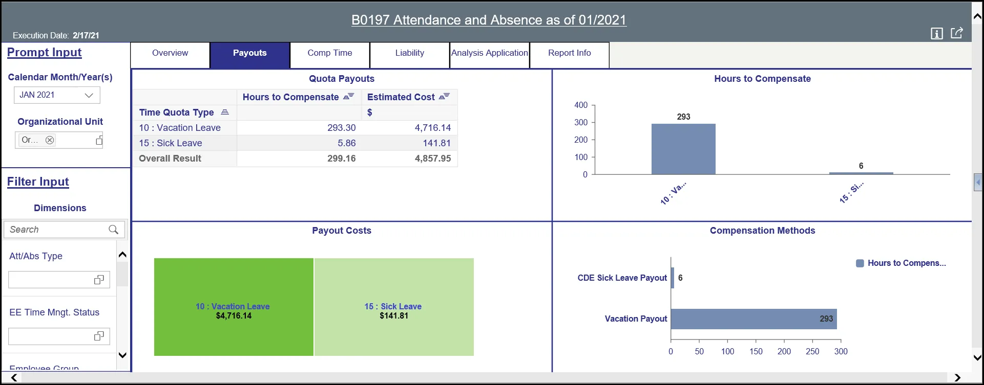 Note: Prompt Input values apply to data across all tabs (Overview, Payouts, Comp Time, and Liability tabs) except Analysis Application.