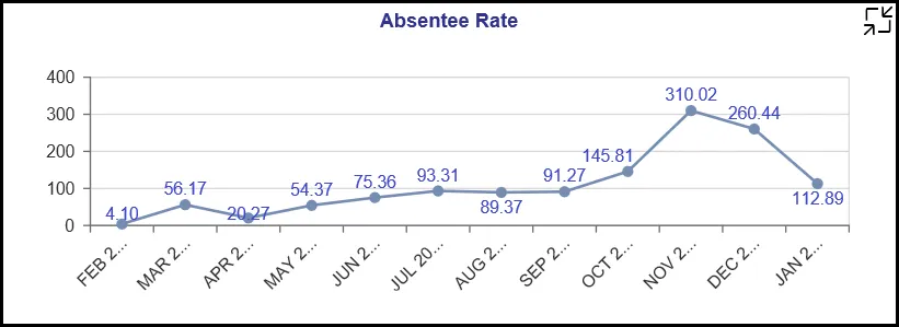 - Detailed view icon on ‘Absentee Rate’ chart will show a full screen view of a stacked bar chart showing Absenteeism in the last twelve months as of the Calendar Month/Year chosen in Prompt Input.