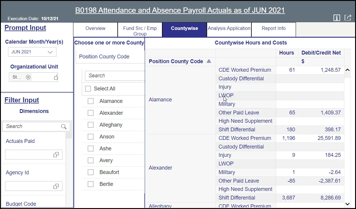 - County wise specifics of attendance/absence types which details actuals paid grouped by county is provided. The ‘Countywise’ tab represents data by county for premium pay and other specific leave wage type.