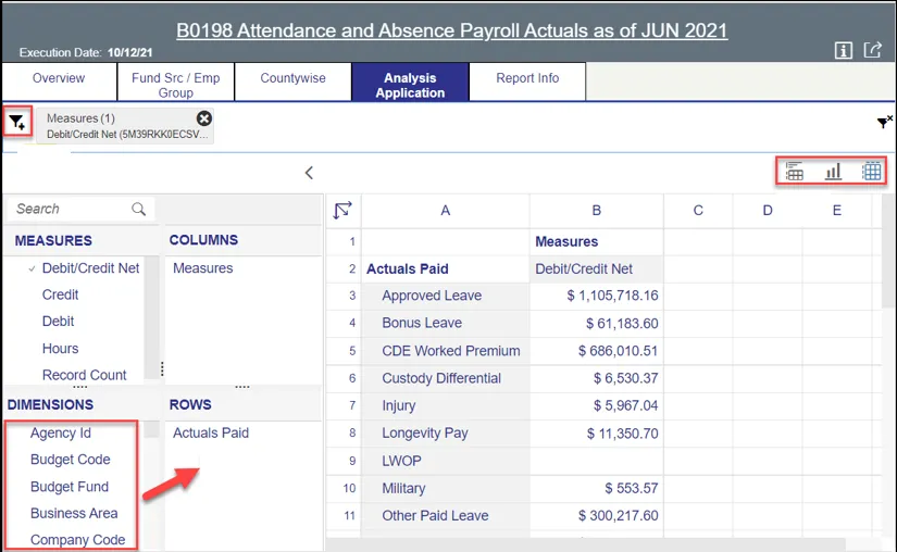 - Report has an ‘Analysis Application’ tab that details Actuals Paid measured by Debit/Credit Net. Agency users can use this Analysis Application tab, an interactive interface to manipulate the data table on the workspace and it allows them to customize the data view and present it in charts on their own.
