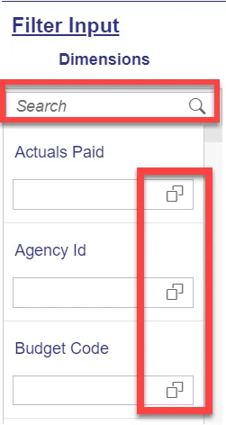 Step 1: Choose the ‘Actuals Paid’ Filter Input dimension on the left side panel and click on the help for values icon on the right.