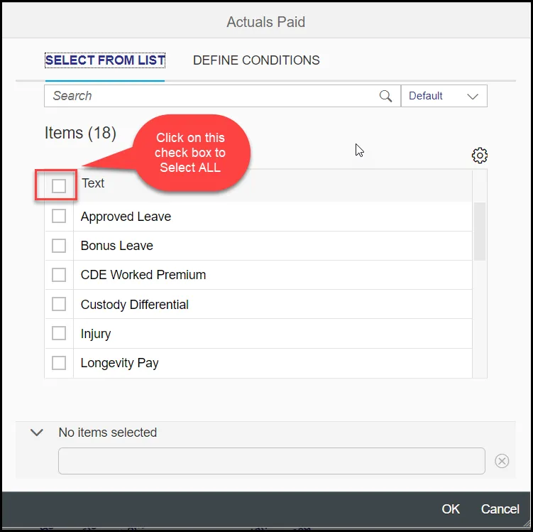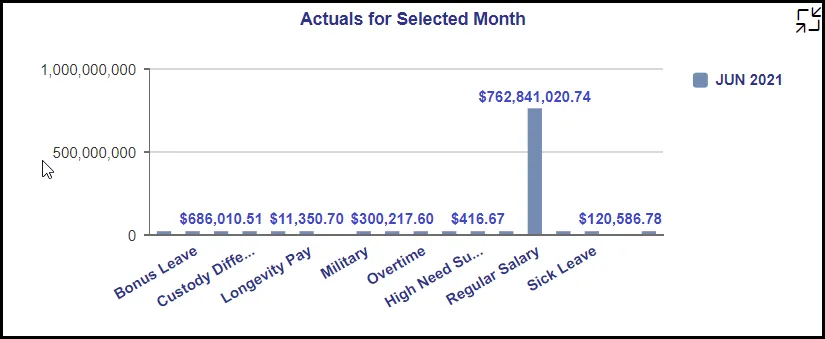 - If Regular Salary or any other wage type group has a huge content value in the cell and makes the chart fonts too small, then temporarily remove ‘Regular Salary’ using the Filter Input Dimension ‘Actuals Paid’ and see if the view is better. You can reset the Actuals Paid filter input dimension later by using Select All check box inside the filter. (Refer the section below ‘How to simplify the initial chart view’.