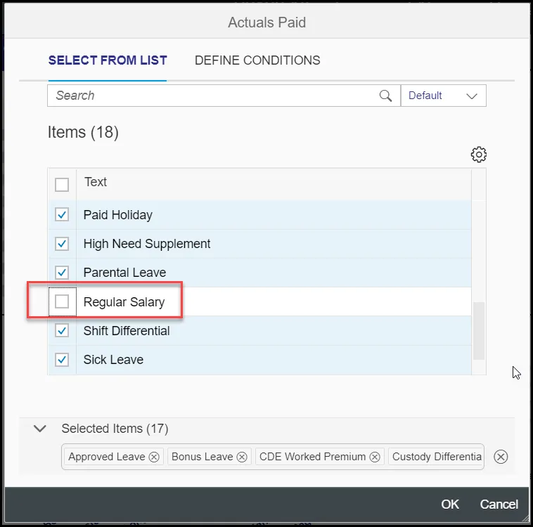 Step 3: Scroll down inside the box to find Regular Salary and uncheck the checkbox of Regular Salary.