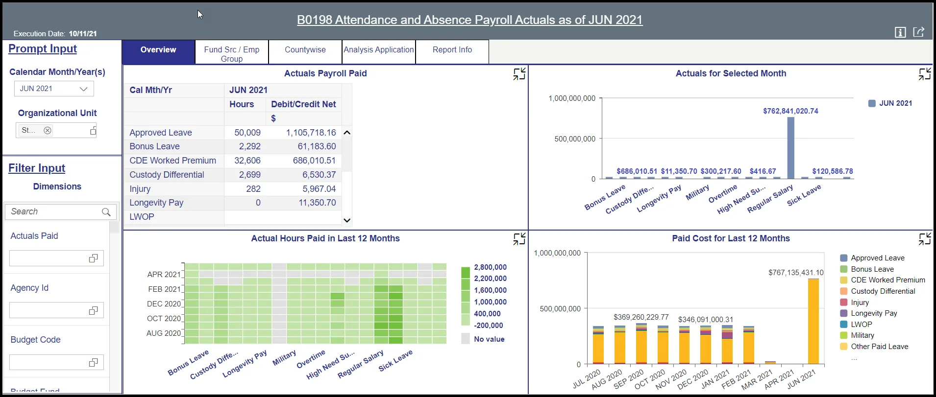 Note: Prompt Input values apply to data across all tabs viz Overview, Fund Src/Emp Group, Countywise, and Analysis Application.