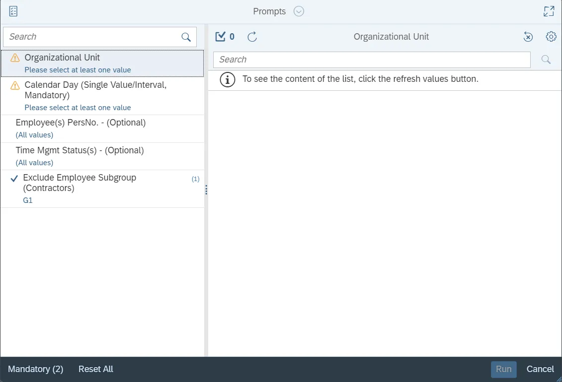 This report is generated after selecting values for the mandatory prompts.  All mandatory prompts must have values selected before the Run Icon can be used to generate the report. Mandatory prompts can be identified as mandatory by the exclamation mark inside of the yellow-orange triangle, the square with the checkmark, or the display of (Mandatory).  Detailed instructions for interaction with each prompt can be found on the Web Intelligence Prompt List on the OSC website.