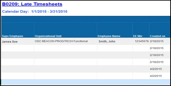 This report displays time that has been released, and not approved, more than a specified number of dates after the work date. This report is applicable only for employees who enter time through ESS.
