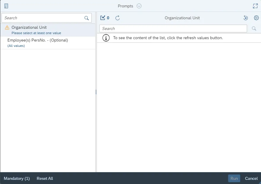This report is generated after selecting values for the mandatory prompts. All mandatory prompts must have values selected before the Run Icon can be used to generate the report. Mandatory prompts can be identified as mandatory by the exclamation mark inside of the yellow-orange triangle, the square with the checkmark, or the display of (Mandatory). Detailed instructions for interaction with each prompt can be found on the Web Intelligence Prompt List on the OSC website.