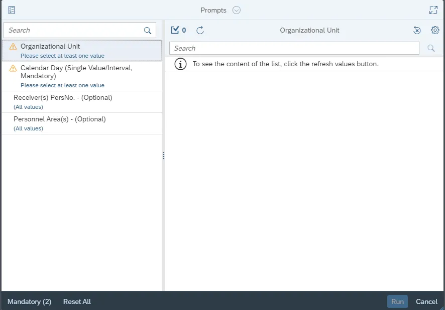 This report is generated after selecting values for the mandatory prompts.  All mandatory prompts must have values selected before the Run Icon can be used to generate the report. Mandatory prompts can be identified as mandatory by the exclamation mark inside of the yellow-orange triangle, the square with the checkmark, or the display of (Mandatory).  Detailed instructions for interaction with each prompt can be found on the Web Intelligence Prompt List on the OSC website.