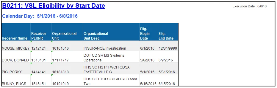 This report displays employees with a VSL Eligibility period that begins and ends during a specified date selection:
