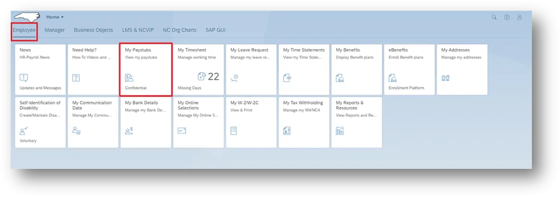 Step 1. Log into Fiori and select the My Paystubs application tile located on the dashboard under the Employee tab.