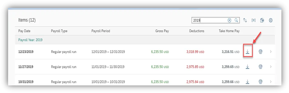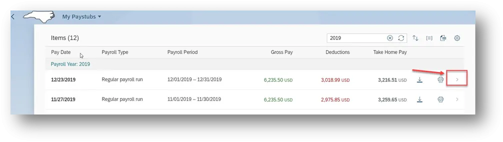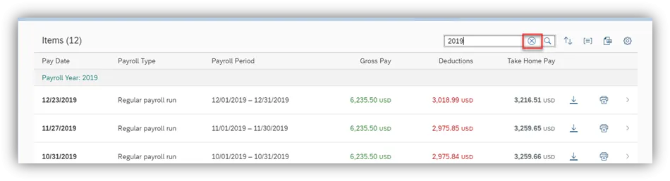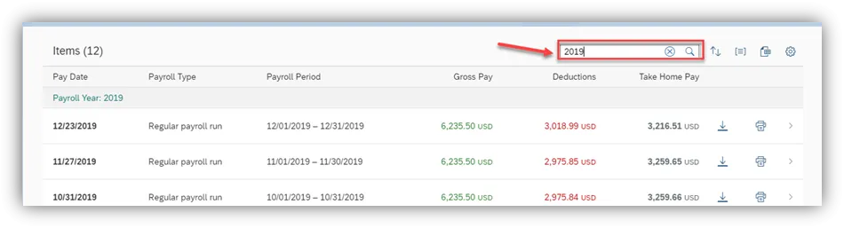 Step 3. To filter on a specific year of pay statements, go to the Search Paystubs field and type in a year. For example, type in “2019” and click Enter on your keyboard or click the Search magnifying glass icon.