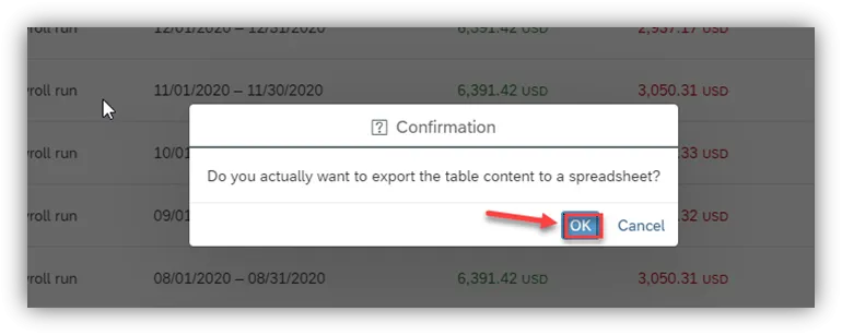 Step 11. Click the Export to Spreadsheet icon in the navigation features to export a .xlsx file. Click the OK button on the confirmation popup window.