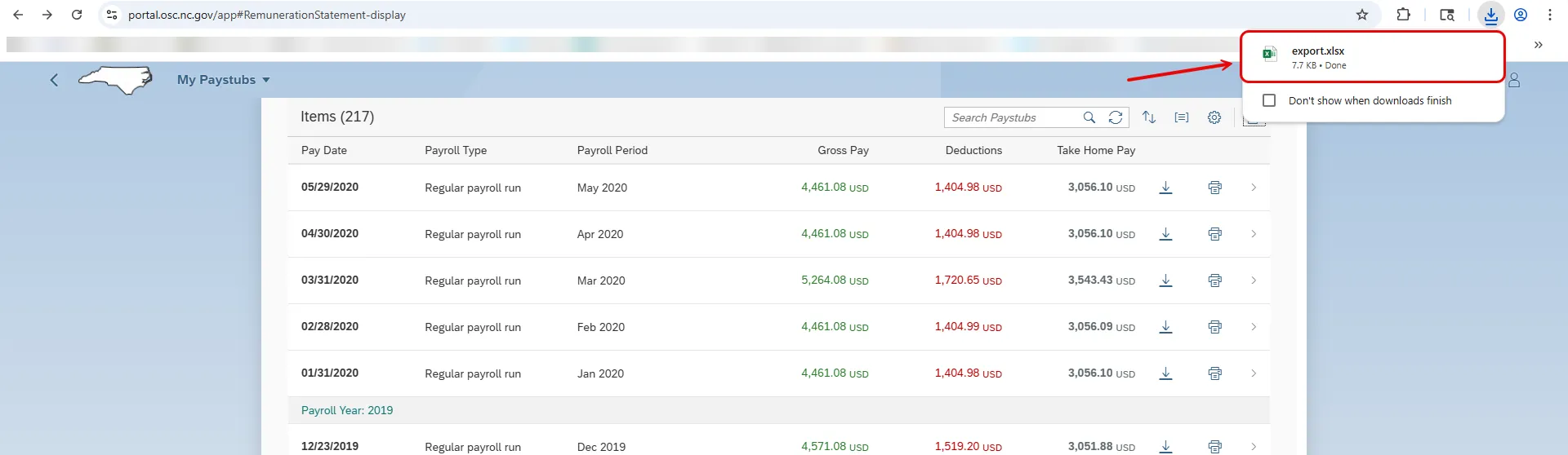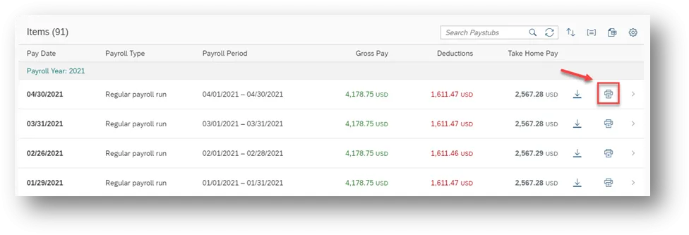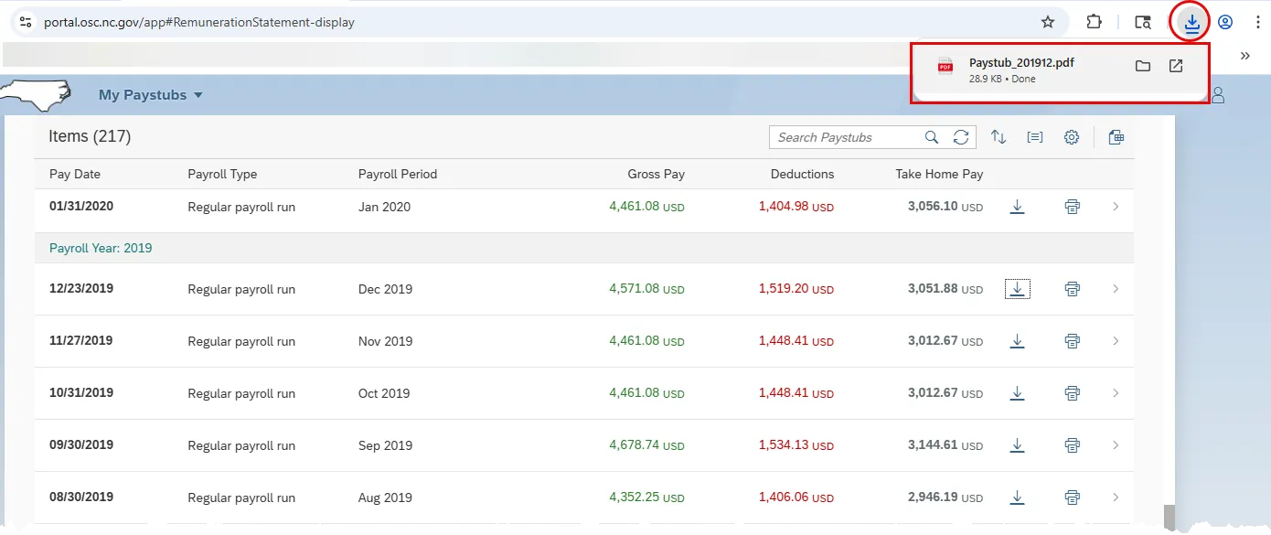 Step 5. To download a specific pay statement, click the Download PDF arrow in a column on the right side of the screen.