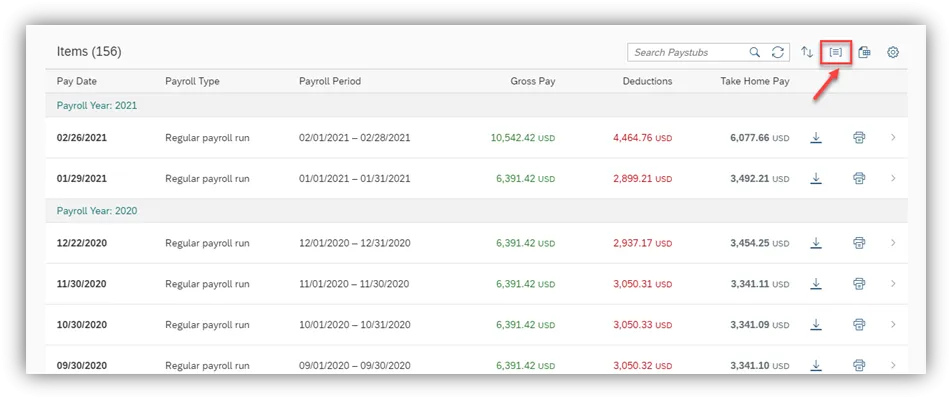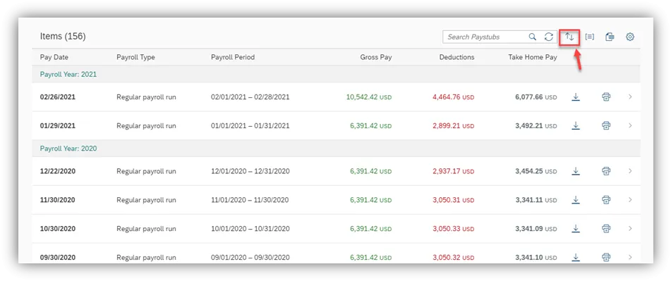 Step 15. Click the Sort your paystubs icon to sort pay statements within the timeframe.