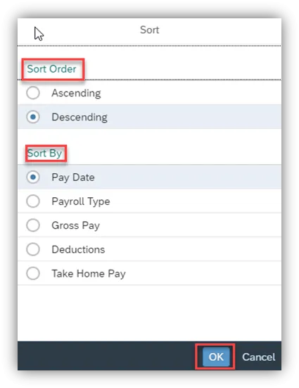 Step 16. You can Sort by Pay Date, Payroll Type, and several other options as well as Ascending or Descending.