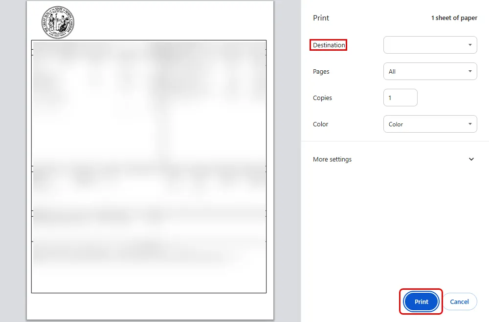 Step 9. A popup window will appear. Choose your printer in the destination field, then click the Print button to print the pay statement PDF.