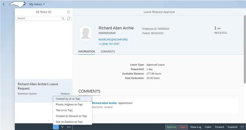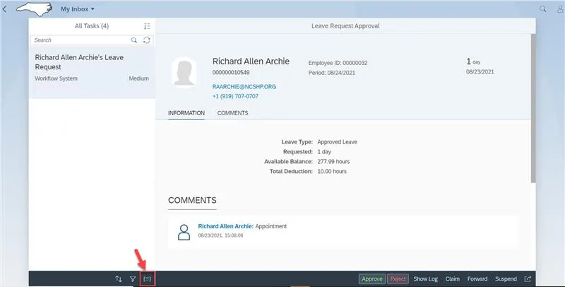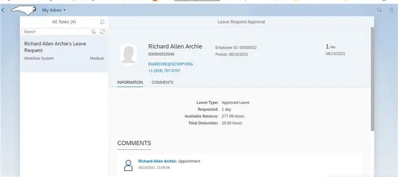Step 2.    Once you have clicked on My Inbox, under All Tasks, the active Leave Request is listed. When the task is Selected, the details of the leave request are displayed along with the information and comments tabs.