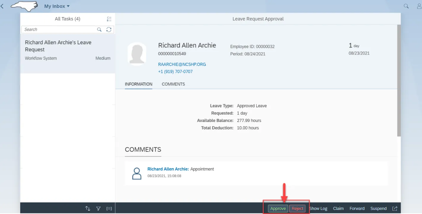 Step 8.    Click Approve or Reject to approve or reject the leave request.