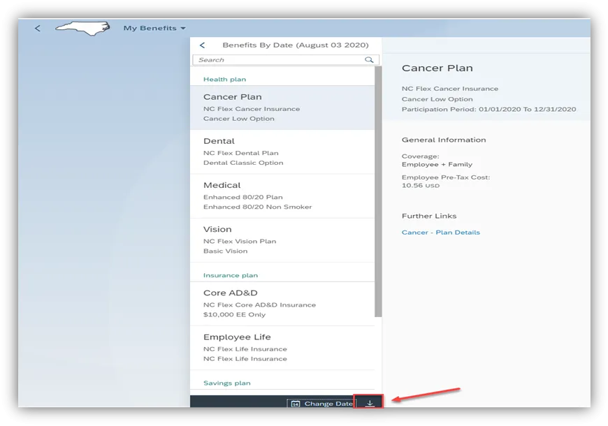 Step 8. To download a PDF report of your Enrolled Benefits, click on the download arrow at the bottom of the screen.