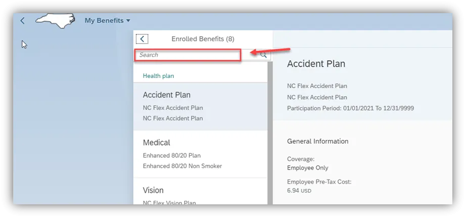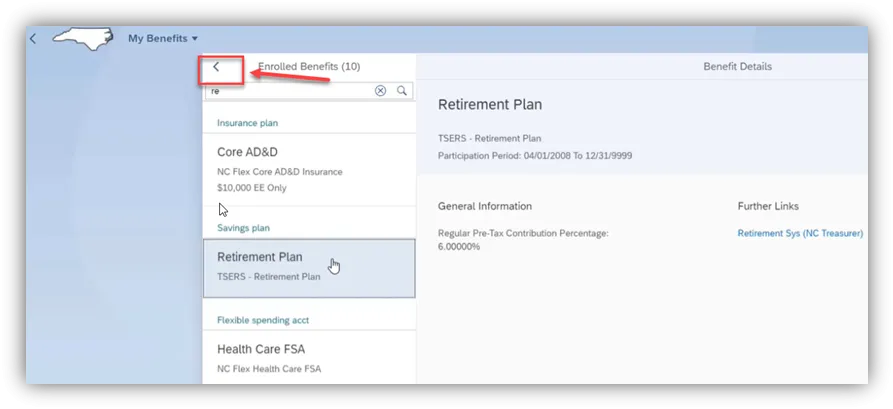 Step 7. When finished, click the arrow at the top of the search window to go back to the main benefits screen.