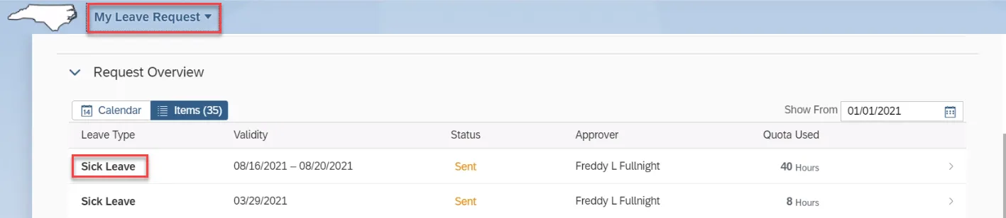 Step 4.    Request Overview is a list of an employee’s requests for leave and the Status of those requests.