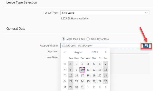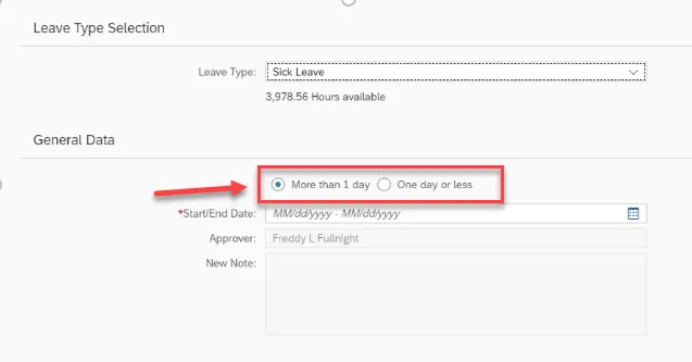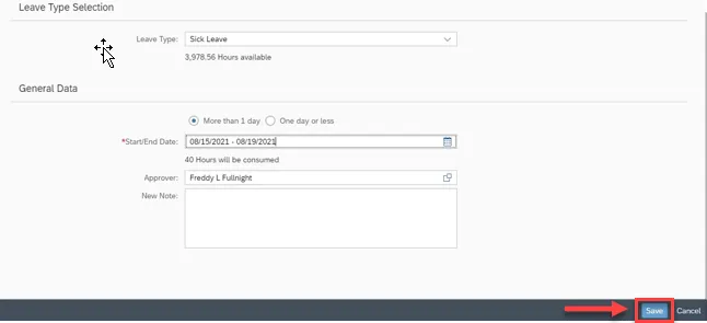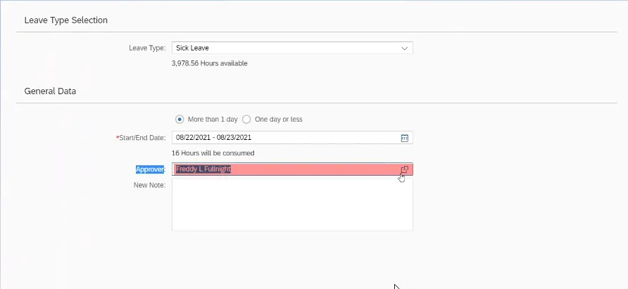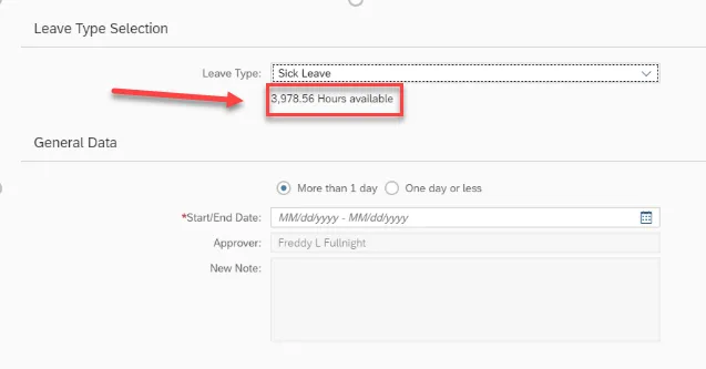 Step 19.    For this example, we have selected Sick Leave for the Leave Type. Under Leave Type, note the available hours listed, which are pulled from the Entitlement balance.