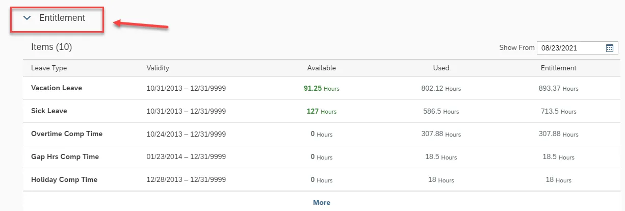 Step 3.    Various leave balances for an employee show up under Entitlement.