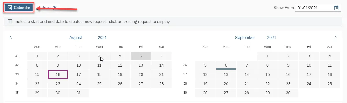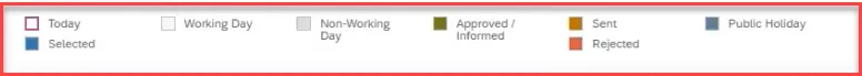 Step 5.    Click Calendar to view requests on a calendar. The legend below the calendar lists the different leave options and their color code.