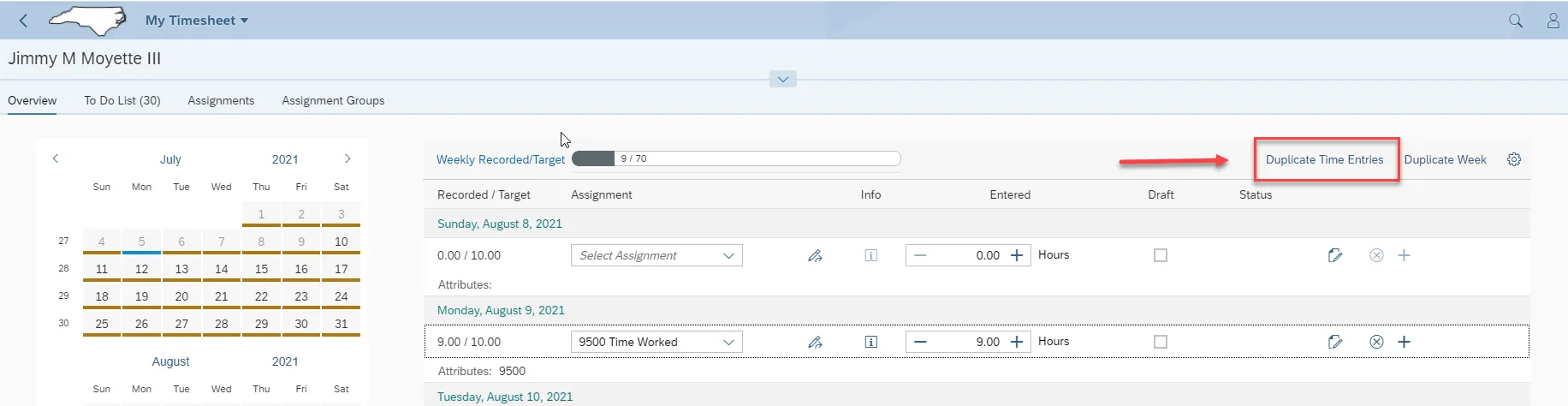 Step 13. Click Duplicate Time Entries to quickly enter time.