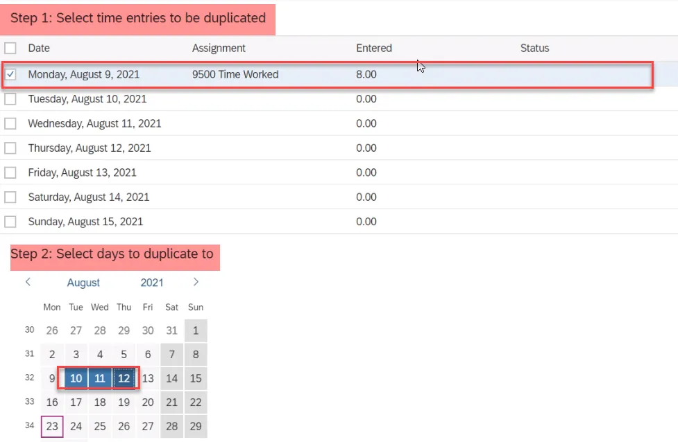 Step 14. This feature can be used when the objective is to record target hours for the week. This is a 2-step process. In Step 1 you will need to select the time entries to be duplicated. In Step 2 you will select the dates from the calendar to duplicate the selected time from Step 1 to.