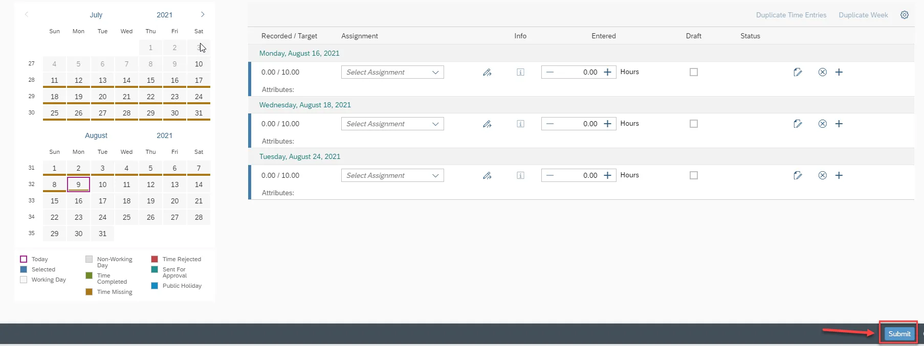 Step 1: Click Monday, August 9, 2021 as the entry to be duplicated.