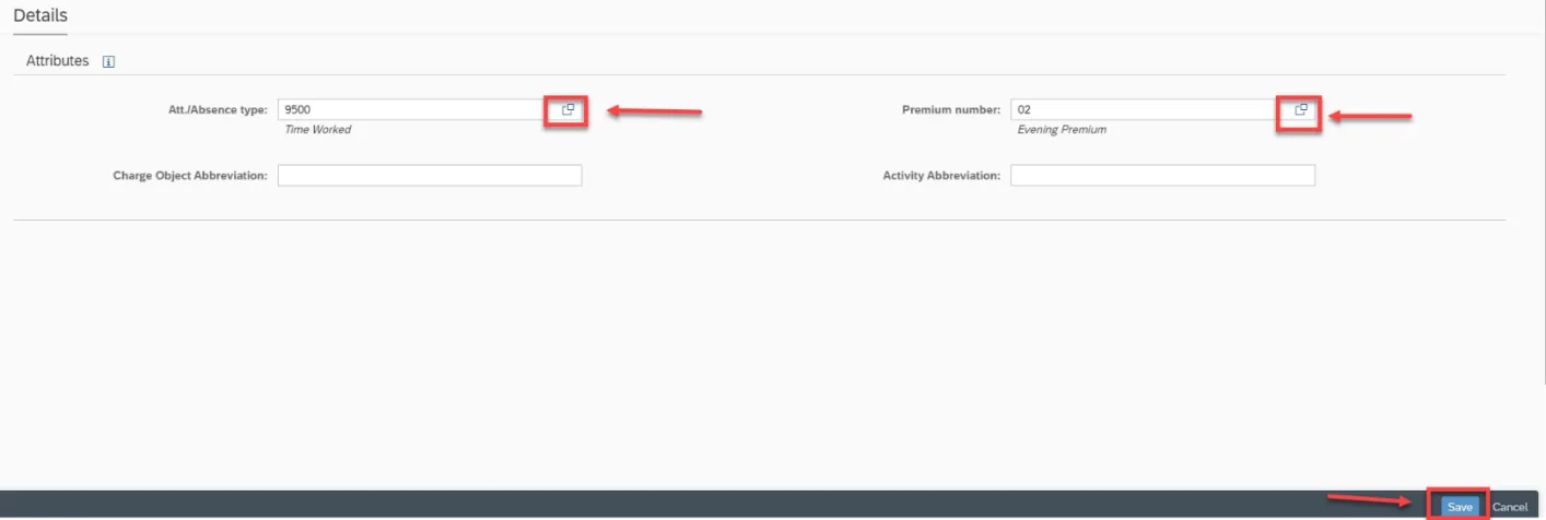 Step 24. Click the Matchcode at the Att./Absence type and select 9500. Then at Premium number, click the match code and select 02, then click Save.
