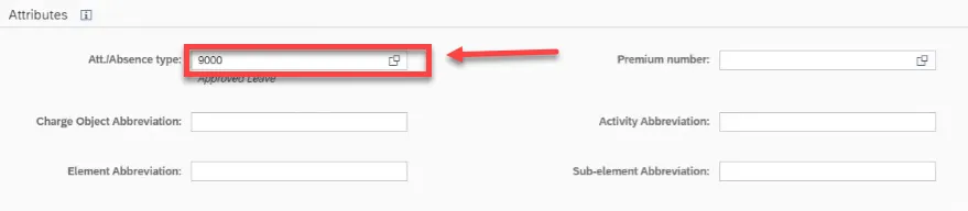 Step 30. Click the matchcode at Att./Absence type and select 9000 for Approved Leave, and then click Save.