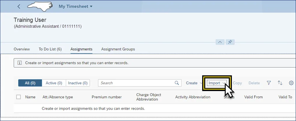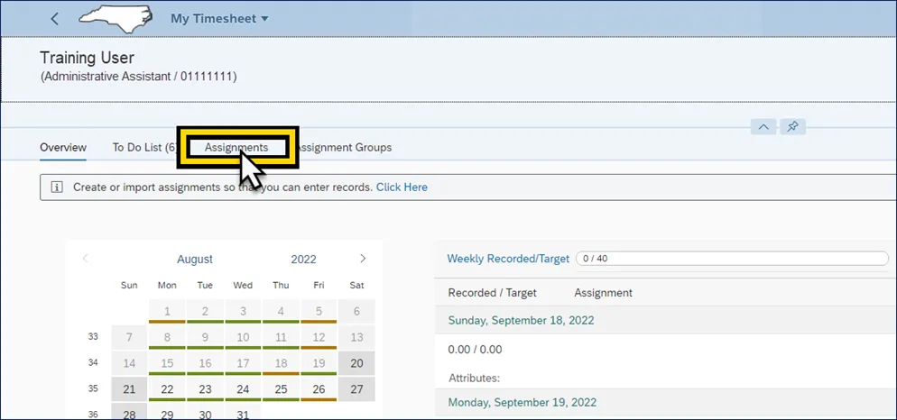 Step 1. After navigating to the My Timesheet Application, click the Assignments action tab.