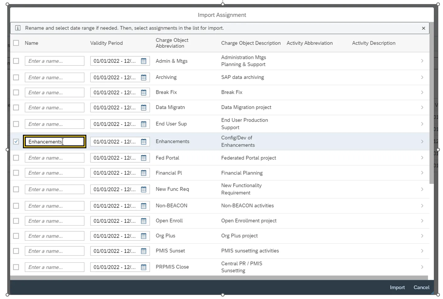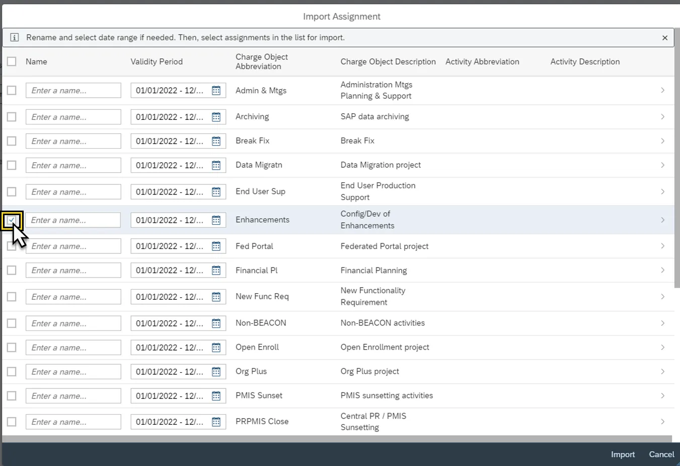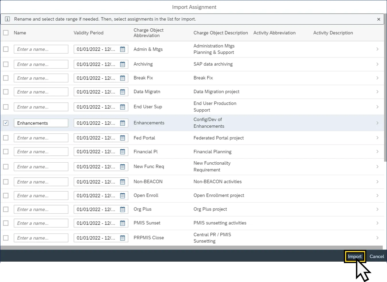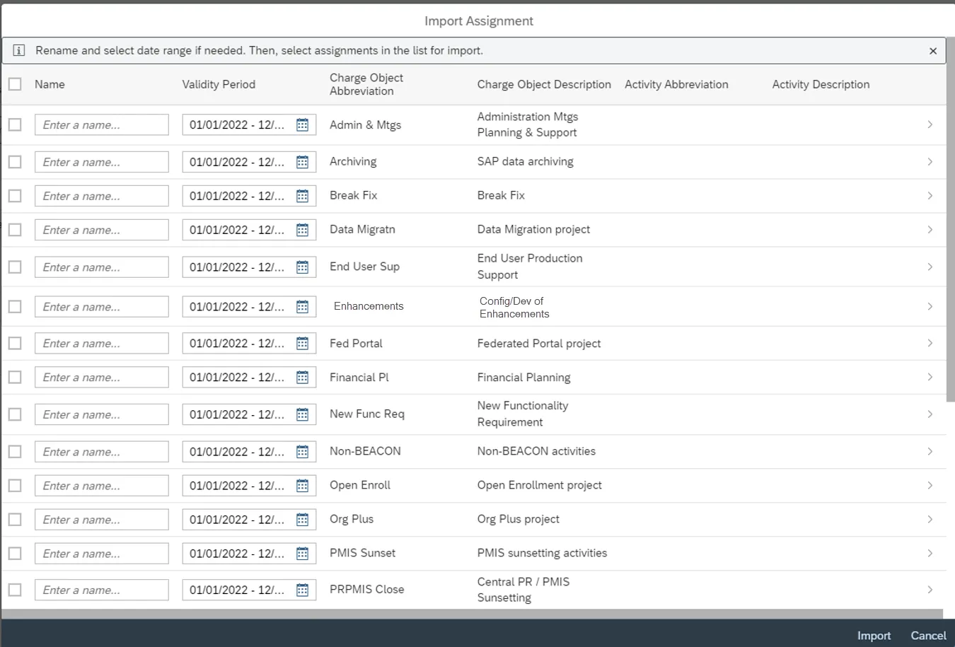 Note: The Import Assignments Worklist will look unique to each user based on the uploaded Charge Objects for their position.