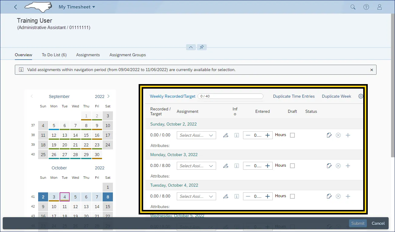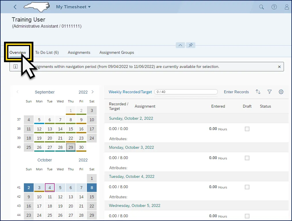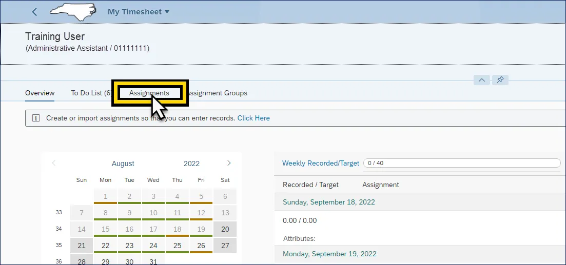 Step 1.    After navigating to the My Timesheet Application, click the Assignments action tab.