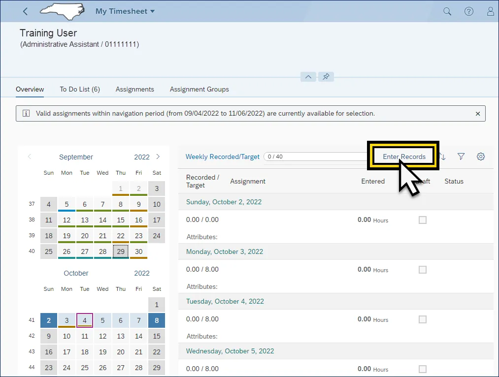 Step 9.    Click Enter Records above the time entry overview.